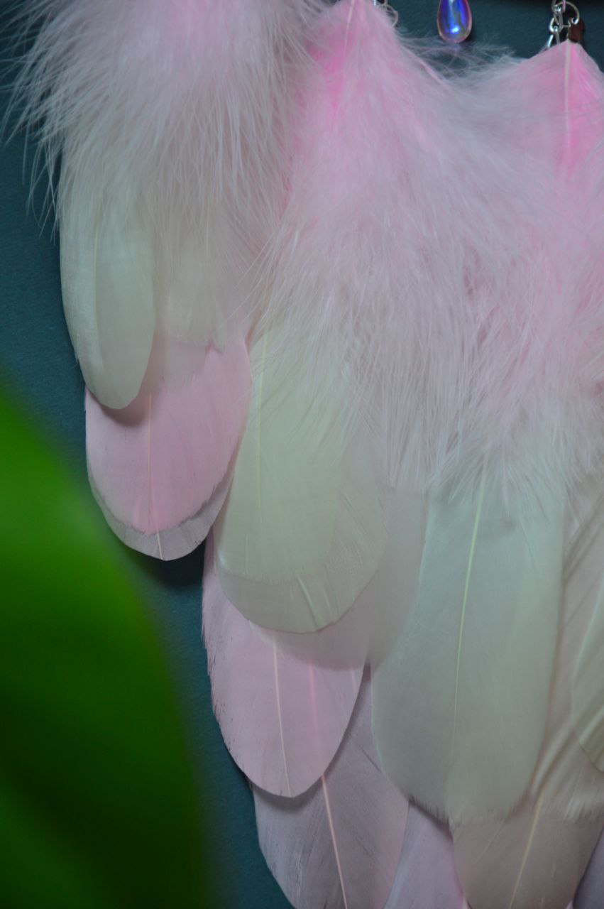 The bottom of the dreamcatcher is adorned with fluffy pink details and natural feathers. Hanging iridescent teardrop beads add a subtle sparkle, catching the light beautifully and enhancing the ethereal look of this piece.