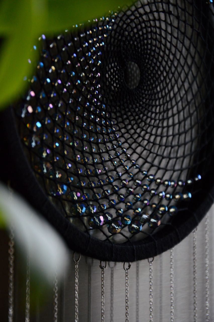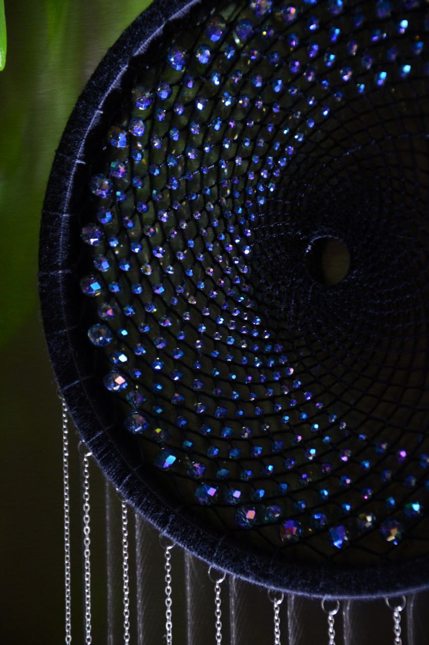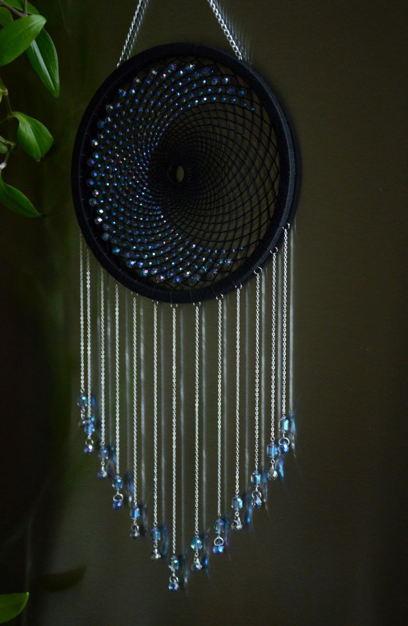 Bring elegance and a touch of celestial magic into your space with this handcrafted black dream catcher featuring a mesmerizing spiral web adorned with shimmering blue crystal beads.