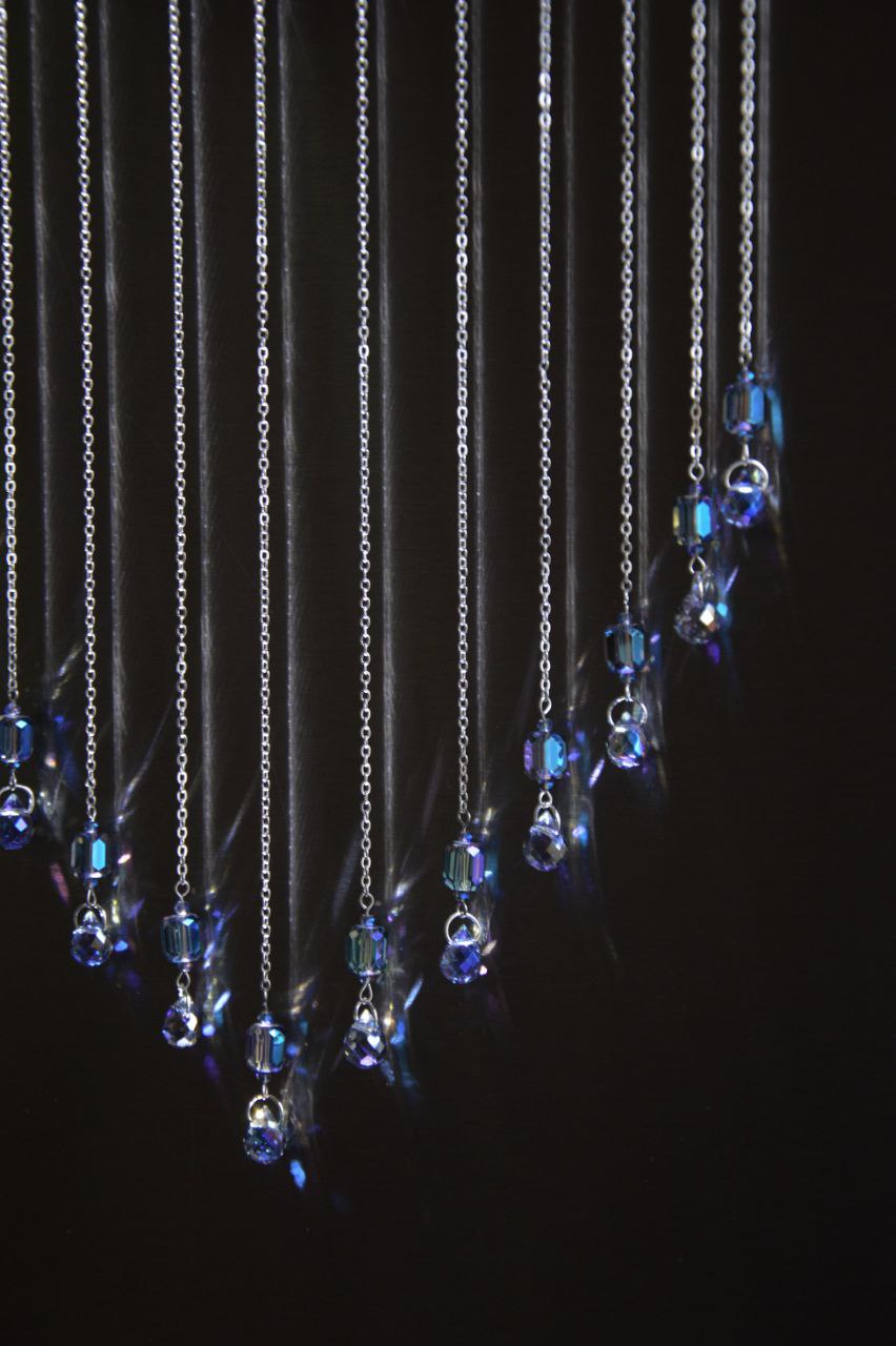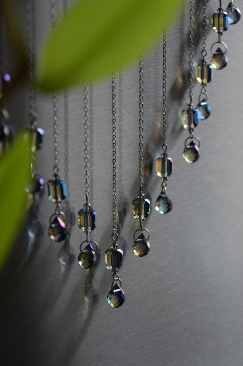 The deep black frame combined with iridescent crystals creates a galaxy-inspired look that reflects light beautifully. Delicate hanging chains with sparkling bead drops add movement and a subtle glow, making it a stunning accent piece for any room.
